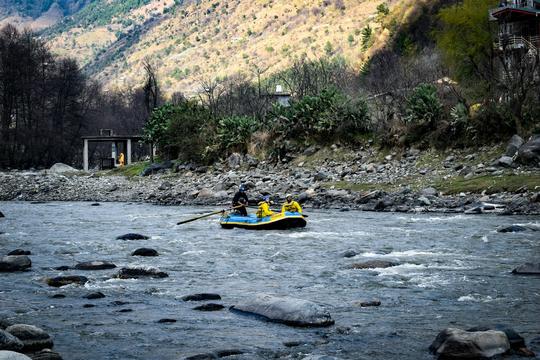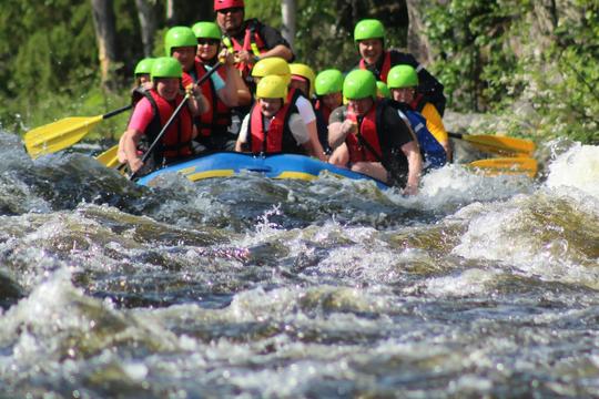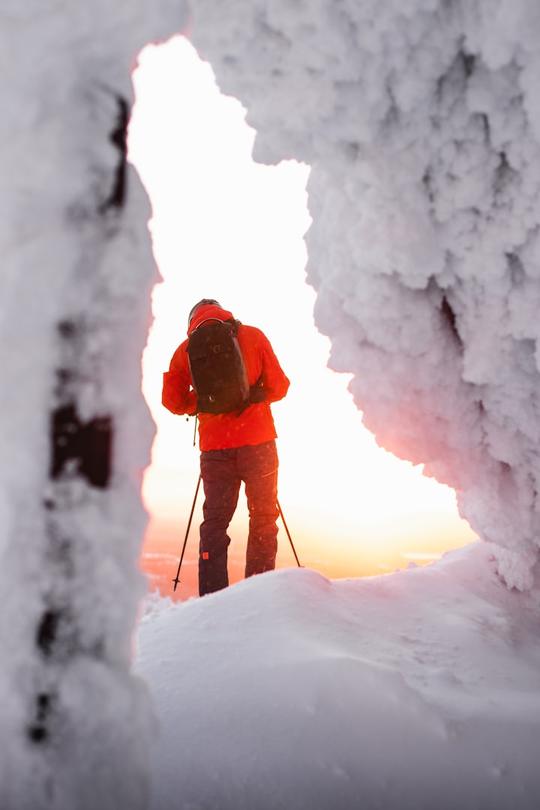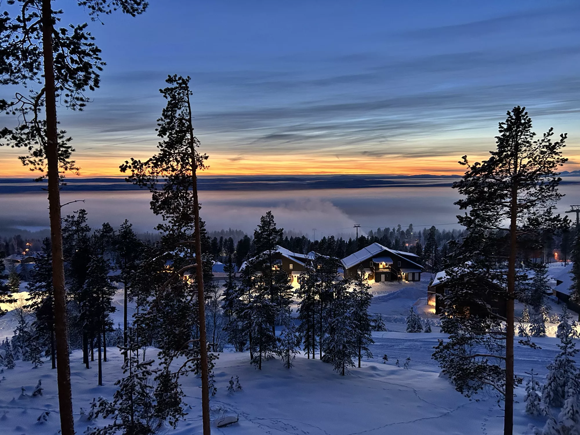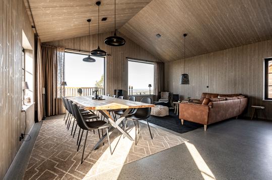 Fullutrustat kök i öppen planlösning kopplat till matplats och vardagsrum med bioetanolkamin